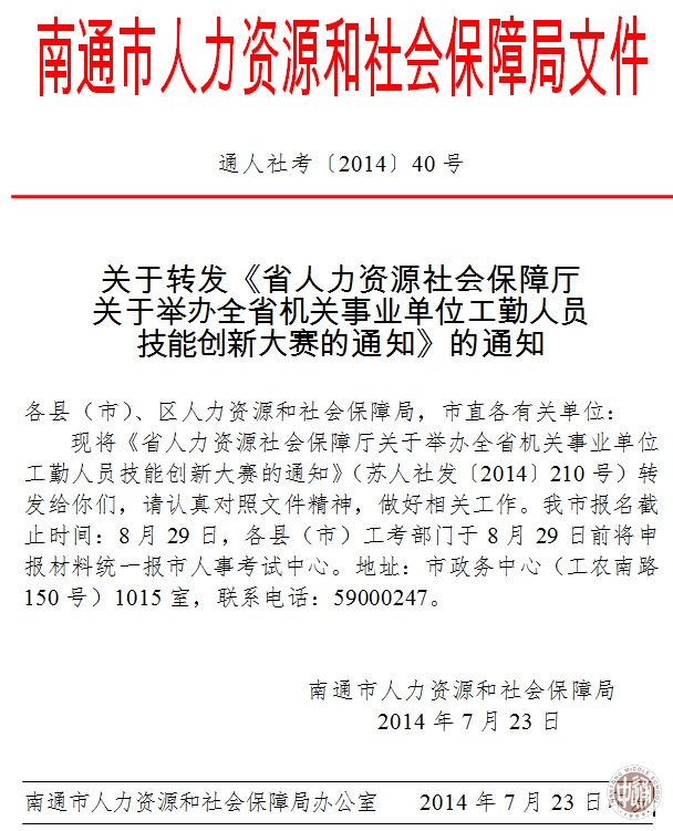 关于举办全省机关事业单位工勤人员技能创新大赛的通知 来源:本站原创 发布时间:2014-08-01 09:30:15 浏览次数: 次 【字体:小 大】 附件:省人力资源社会保障厅关于举办全省机关事业单位工勤人员技能创新大赛的通知及申报表 分享到: 【打印正文】