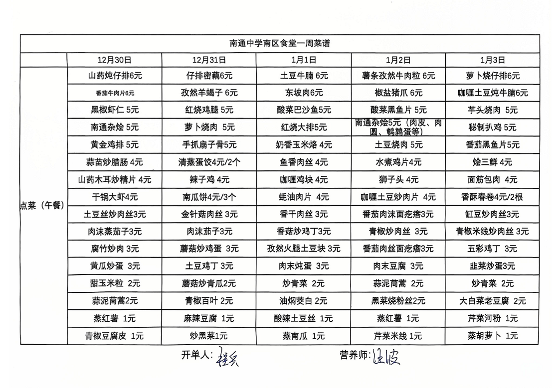 南区食堂菜谱12月30日-1月3日