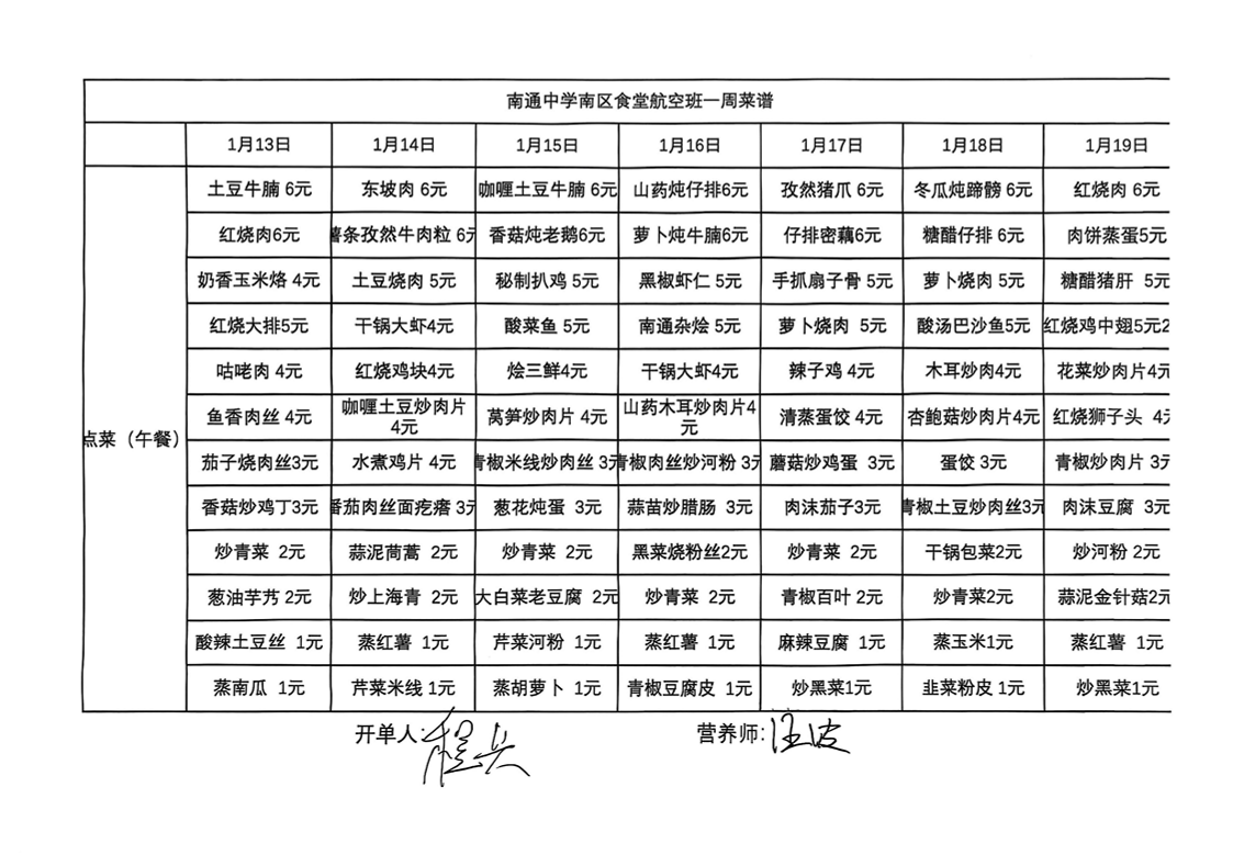 南区食堂航空班菜谱1月13日-1月19日