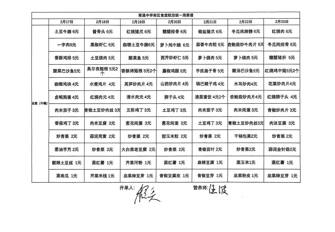 南区食堂航空班菜谱2月17日-2月23日
