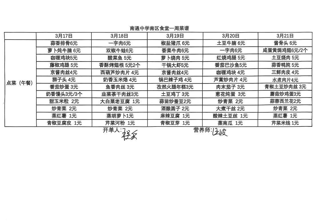 南区食堂菜谱3月17日-3月21日