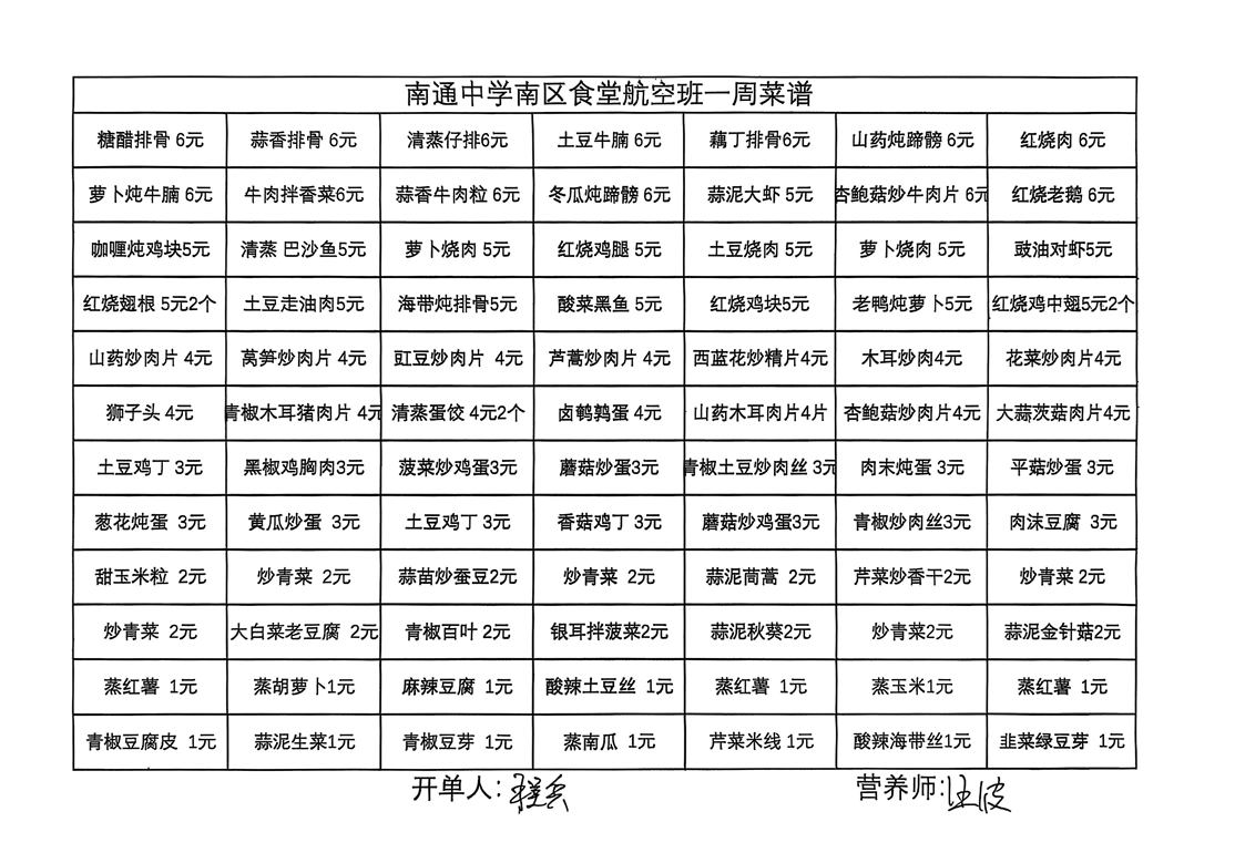 南区食堂航空班菜谱3月17日-3月23日