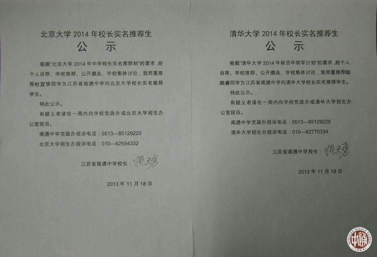 北京大学、清华大学2014年校长实名推荐生公示