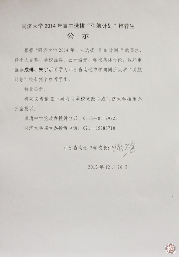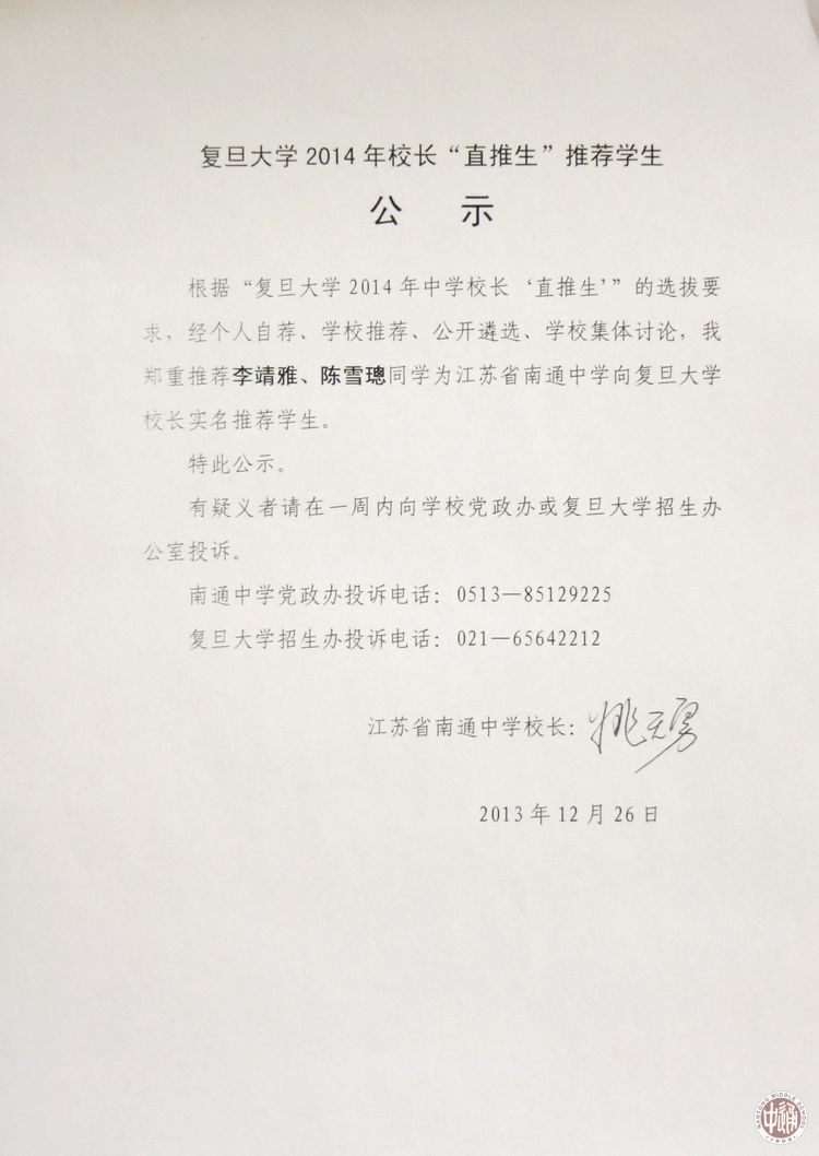 复旦、交大、同济2014年校长直荐生公示