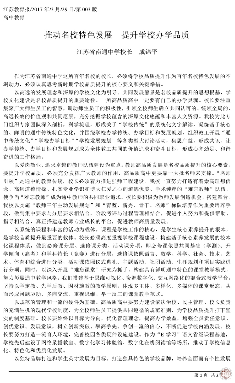 推动名校特色发展提升学校办学品质
