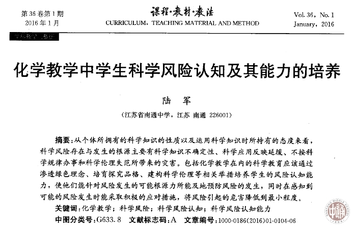 《课程•教材•教法》2016年第1期发表了工作室领衔人陆军老师的文章,题目为《化学教学中学生科学风险认知及其能力的培养》,该文是陆军老师2015年4月9-11日在苏州市新草桥中学参加“江苏省中学化学名师研修会”时的发言。