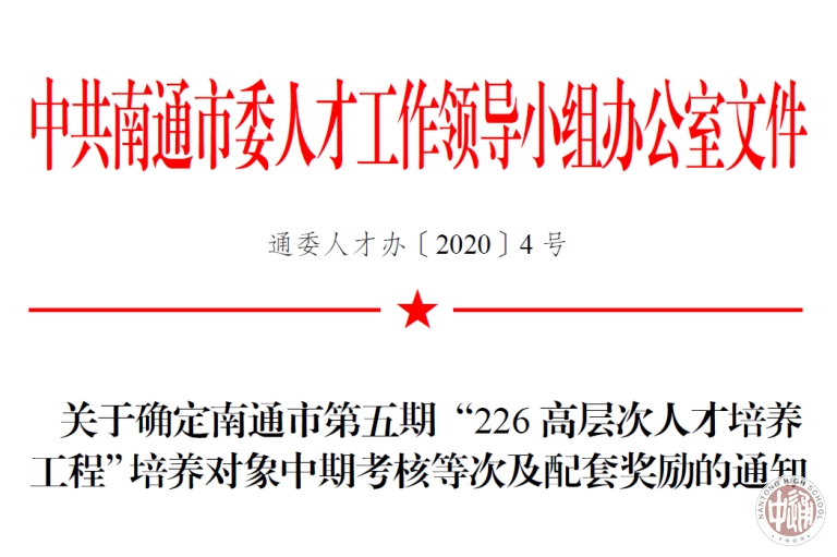 日前,中共南通市委人才工作领导小组办公室公布了南通市第五期“226高层次人才培养工程”中期考核优秀等次人员名单,我工作室陆军、陈建云、张弛分获第一、二、三层次培养对象的优秀等次。