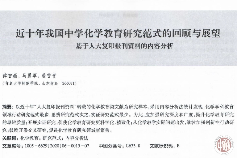 6月10日出版的全国中文核心期刊《化学教学》发表青岛大学师范学院教授马勇军及其研究生律智赢、姜雪青的研究论文《近十年我国中学化学教育研究范式的回顾与展望——基于人大复印报刊资料的内容分析》,该研究以2010至2019年中国人民大学复印报刊资料《中学化学教与学》全文转载的1946篇文献为样本,运用内容分析方法探寻我国中学化学教育研究的主要范式。