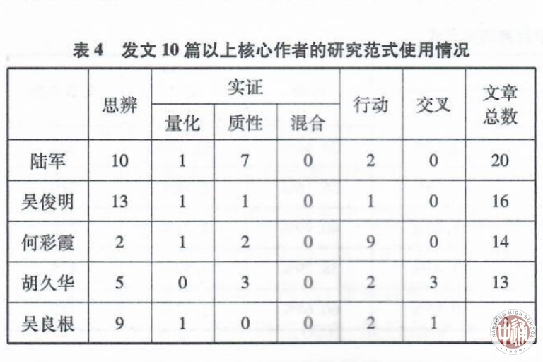 该研究在以“第一作者发文10篇以上”作为“核心作者”标准进行统计时,共获得“核心作者”9位。从“核心作者”所在单位看,中学3位,高校6位;从“核心作者”发文总数看,居前3位的是我工作室领衔人陆军20篇、上海师范大学教授吴俊明16篇、北京教育学院教授何彩霞14篇;从“核心作者”研究范式看,呈现“以思辨研究为主”的特征,陆军“在使用思辨研究的同时,很注重实证研究,特别是质性研究”。