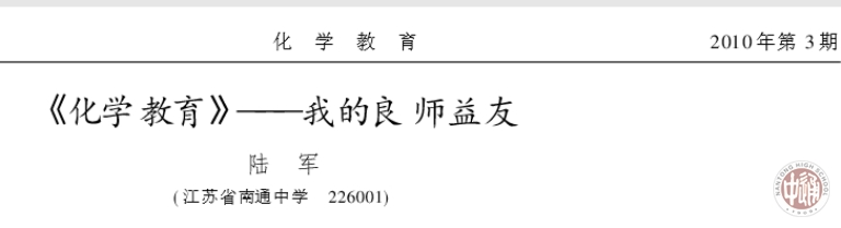 2001年,我调入江苏省南通中学工作。从用高中教材教师范生到用高中教材教高中生,其中有应对高考等诸多变化,这时又恰逢新一轮课程改革的起步,《化学教育》等杂志对我的教学转型和进入新课程又提供很大的帮助。为了顺利地实现这一转型,特别是在新课程中能走在前列,我在《化学教育》等杂志中搜集王祖浩、王磊、吴星等新课程专家的研究论文,以获取他们的理论支持,并利用基础化学教育实践的平台和《化学教育》等杂志提供的园地进行实践和研究。2006年,人民教育出版社邀请我加盟新课程实验教科书培训团,先后赴辽宁、江苏、新疆、陕西等地对高中化学教师进行教材培训,讲课中我除了介绍自己的思考和体会以外,《化学教育》等杂志上新课程专家和先期实施新课程省份中学教师的文章是我讲座的重要素材,我用新课程专家的观点提升讲座的理论层次,用新课程省份中学教师的文章充实讲座中的案例,从而提高了新课程教材培训的实效。随着新课程实践和研究的深入,江苏教育出版社出版了我的专著《新课程化学教学的思考与实践》。这时,《化学教育》不惜版面,在2009年第12期发表南京师范大学课程与教学论(化学)博士生导师李广洲教授的评论文章《喜看一位中学教师与新课程的同步成长——兼评〈新课程化学教学的思考与实践〉》,李老师在评鉴我新课程研究成果的基础上,认为专著“对中学化学教学改革和新课程的推进,具有相当的借鉴和参考价值”,这又给我莫大的鼓舞,激起我继续从事化学教育的无限动力。