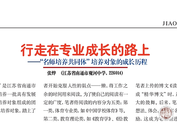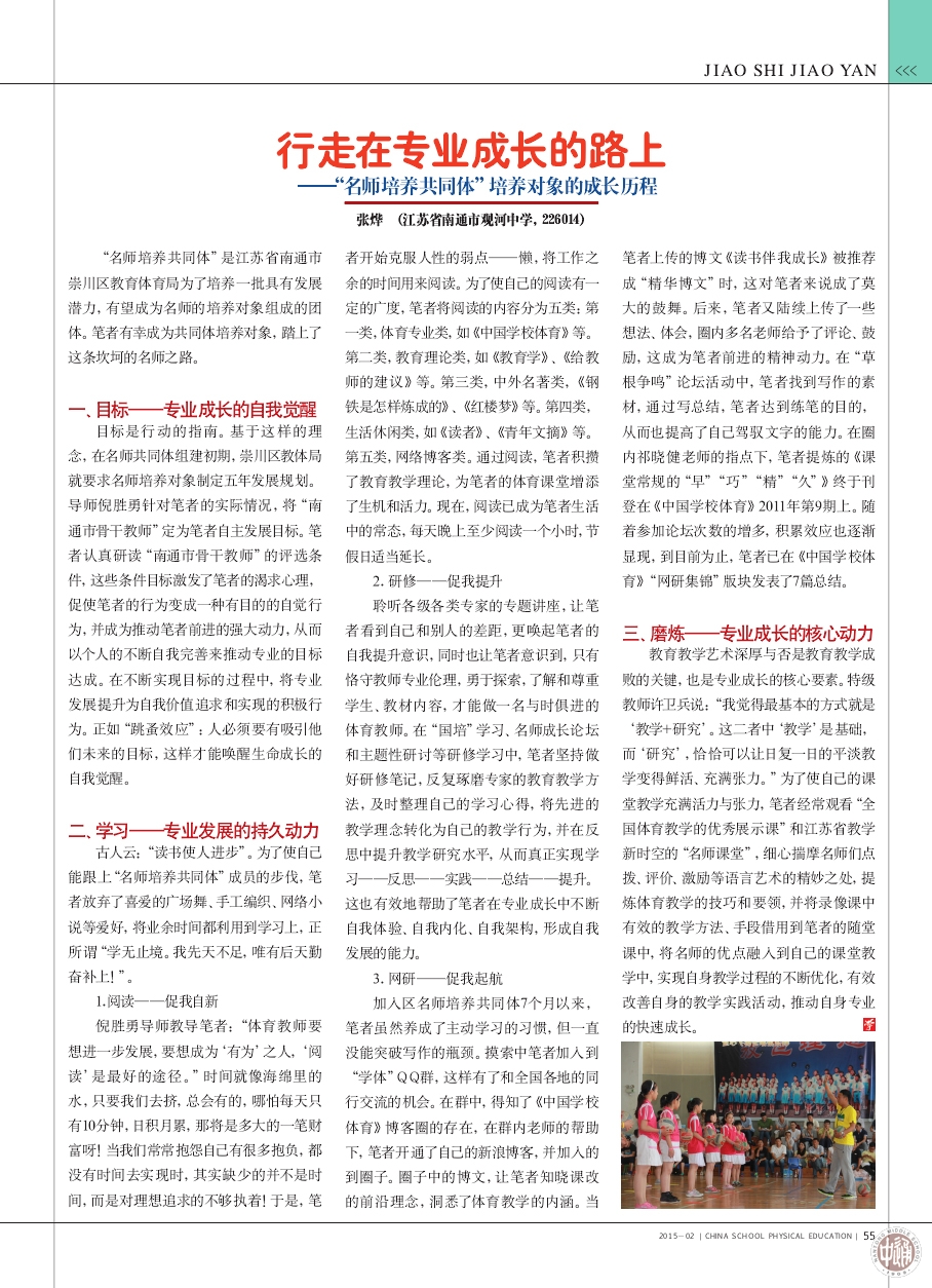 工作室张烨老师在《中国学校体育》讲述成长经历 来源:本站原创 发布时间:2015-03-04 17:07:15 浏览次数: 次 【字体:小 大】 今天读到张烨老师写的成长经历,很有感触。曾有人说过成功没有捷径,惟有勤奋而已,张烨老师真的很勤奋,读书、磨课、写作、沙龙都是积极参加,专业发展就成为了她课余生活的全部。一份付出,一份收获,她五年的目标是南通市骨干教师,但是她五年已经超额完成了任务,在去年年底被评为了南通市体育学科带头人。希望工作室其他的成员读了张烨老师的成长经历,可以和自己做一个对照,也许会给你带去一些心灵的触动。 点击看大图 分享到: 【打印正文】