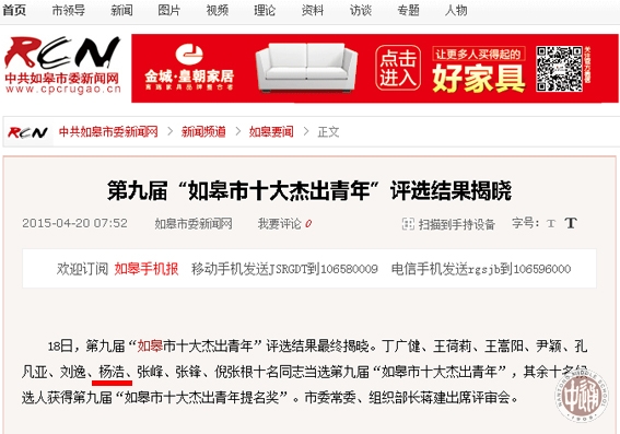 工作室杨浩老师当选第九届“如皋市十大杰出青年” 来源: 发布时间:2015-05-13 12:06:28 浏览次数: 次 【字体:小 大】 介于最近忙碌,漏报重要新闻,现在补上。在大家积极投票支持的基础上,工作室杨浩老师光荣当选第九届“如皋市十大杰出青年”。向他表示祝贺。 链接地址:http://news.cpcrugao.cn/2015/0420/88160.shtml 分享到: 【打印正文】