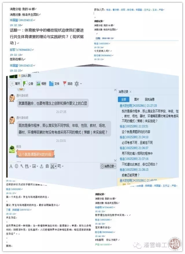 本次活动历时近一个月,犹如一缕花香沁人心脾,留有余香。团队充分发挥网络平台的功能,从“话题研讨”、“好文共享”等方面开展活动。“话题研讨”是每周六晚7点30分—9点30分在QQ群里进行,每次安排四位主持人,主持人会根据自己研究的主题内容抛出话题,如体育课堂教学基本现状,共生体育课堂构建的基本问题,共生体育课堂操作策略,共生体育课堂的评价,不同教材、课型共生体育课堂的典型案例等。同时,主持人还将从“研究背景”、“主题阐述”、“研究目标”、“研究内容”等方面进行具体阐述,其他成员结合自己平时的研究心得进行线上互动,思维碰撞。“好文共享”是每人推荐一篇与“共生”有关的文章,字数不限,在文章前面附上100—200字左右的推荐理由,上传在“杨浩共生团队”群文件里,供大家学习。团队成员可自主选择、合理安排好时间,细细品读、慢慢回味、用心思考着每一篇文章,QQ群或微信群里随时可看到大家阅读与交流的痕迹,有话则长,无话则短,但字里行间都流露着自己真实的感悟。