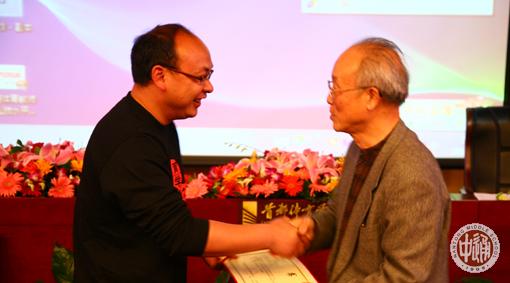 4月24日上午,潘雪峰老师在大会进行了论文专题报告,以图文并茂的丰富形式展示向全体与会人员介绍了自己的研究成果,并由由学校体育前辈曲宗湖先生向作者颁发了证书。