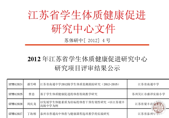 潘雪峰老师申报的《江苏省南通中学2012级学生体质监测跟踪研究(2012-2015)》,日前评审获得通过,确定为一般课题。
