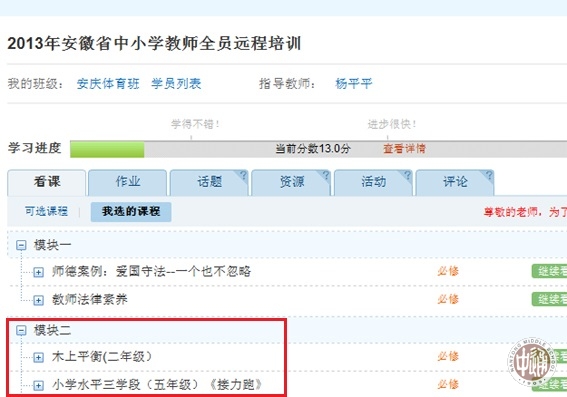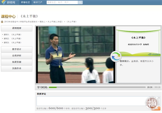 日前在安徽省2013-2014学年度小学教师“有效学习指导”专题远程培训活动中,工作室金海滨老师的《木上平衡》和《接力跑》两节课被作为学员学习的研修课例。参训老师给予了高度评价,纷纷留言。如:金老师的课堂教学组织教法新颖,老师的示范做的很到位,动作优美,值得学习;从实际教学出发,寓教于实际,应该经常推出这样的学习课程;优秀教师上课,我受益非浅……