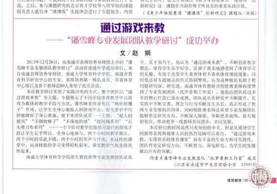《体育教学》2014第1期报道团队活动 来源: 发布时间:2014-02-14 09:26:13 浏览次数: 次 【字体:小 大】 《体育教学》2014第1期报道了讨论潘雪峰专业发展教学研讨活动。本次团队活动虽然时间短,但是取得了良好的效果,也产生了积极的影响。 分享到: 【打印正文】