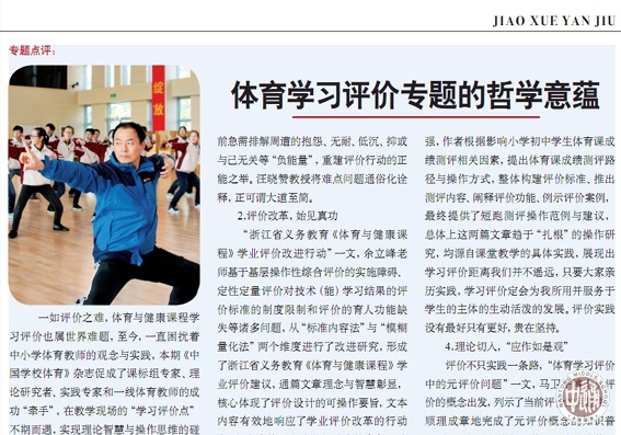 祁晓健老师在《中国学校体育》做专题点评 来源: 发布时间:2014-04-21 11:25:02 浏览次数: 次 【字体:小 大】 《中国学校体育》2014年第4期教学研究栏目推出了学习评价专题,工作室祁晓健老师(“学体名师专家库”培养对象)对专题文章进行了点评。他的文字蕴藉睿智,哲思隽永,既有启人心智之效,又有振聋发聩之功,请工作室的每一位老师认真研读学习,近期将进行专题交流。 全文见大图 P1 P2 分享到: 【打印正文】
