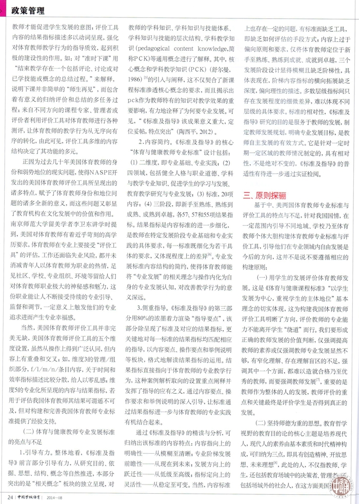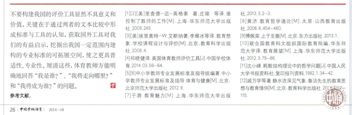 《中国学校体育》2014年第8期,工作室祁晓健老师发表了《标准与工具:从外在规约走向内在自律——中、美体育教师专业标准与评价工具研析》通过对美国体育教师评价工具的剖析,关照我国《中小学教师专业发展标准及指导(《体育与健康》)提出了自己的认识,在最后的专题点评中,祁老师提出了本期专题缺乏一线体育教师结合自身专业实践进行案例的遗憾,实质上也是委婉地对工作室所有老师的批评。从我自身开始向祁老师表示道歉,没有能够很好地完成工作室布置的任务,希望在以后的工作中,不断努力,共同发展。