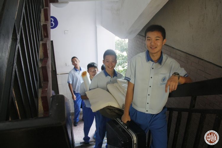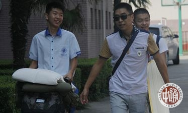 “高二的学长们不仅帮我们搬运行李,而且实行一站式服务:首先,带我们去办理报到手续,然后,指引我们去领取生活物资,而且他们很细心,把所有的生活物品都整理打包好一起发给我们;最后,带我们去公寓宿舍,在宿舍里还有定点服务的学长,他们会指导我们整理床铺和物品的有序摆放。”