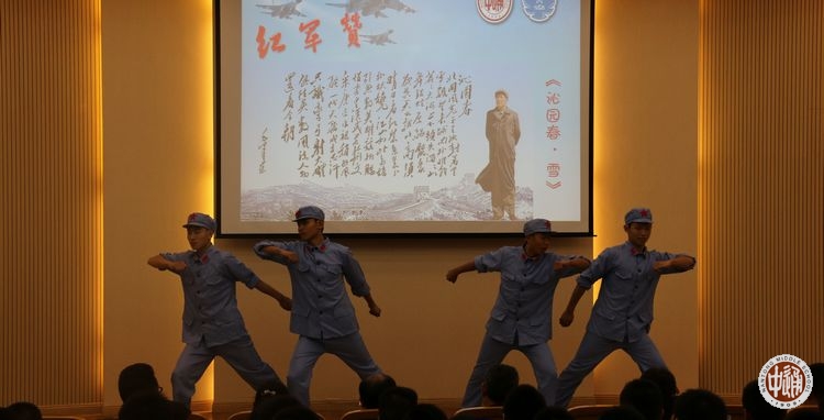 为了歌颂长征途中红军的万丈豪情,张正、胡康佳、赵少博、杨海涛等四位同学饱含深情、联袂朗诵的《长征组诗》,即《七律· 长征》《忆秦娥·娄山关》《清平乐·六盘山》《沁园春·雪》,博得了在场所有人的阵阵热烈掌声。
