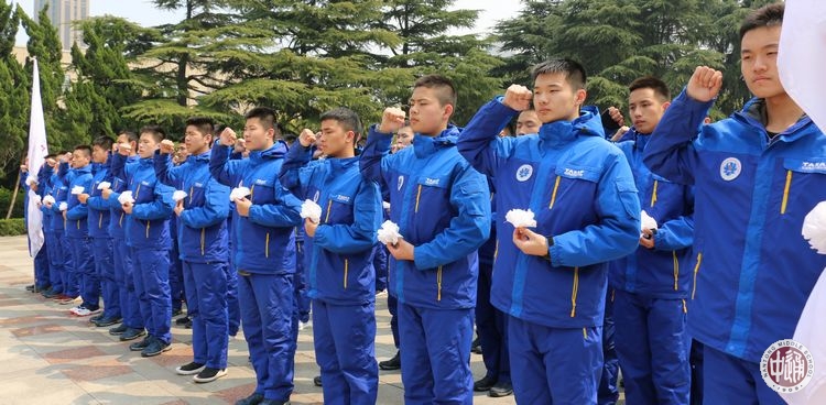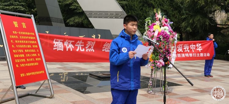 在学员代表向革命烈士纪念敬献花篮后,高一航空班的四位学员进行了深情朗诵,讴歌了在缔造新中国的过程中革命烈士们的丰功伟绩。高二航空班张正同学带领全体学员进行了庄严宣誓:“我是一名光荣的南通中学航空班学员,生活在和平幸福的时代,纯朴的校风指引我的健康成长。今天站在烈士墓前,我郑重地立下誓言:继承先烈遗志,以英雄为楷模、以军人为榜样,坚定蓝天梦想,努力学习,刻苦训练,为青少年航校增光添彩!”