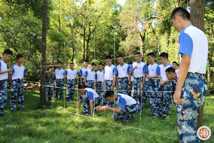 教员指令:“前方已被敌人设置高压电网,需静悄悄地快速通过。”(规则:在规定时间内,每小组9个人,从3×3九个不同的缺口中通过,身体任何部位触碰到白线及判定为阵亡,通过最多人数的小组获胜)