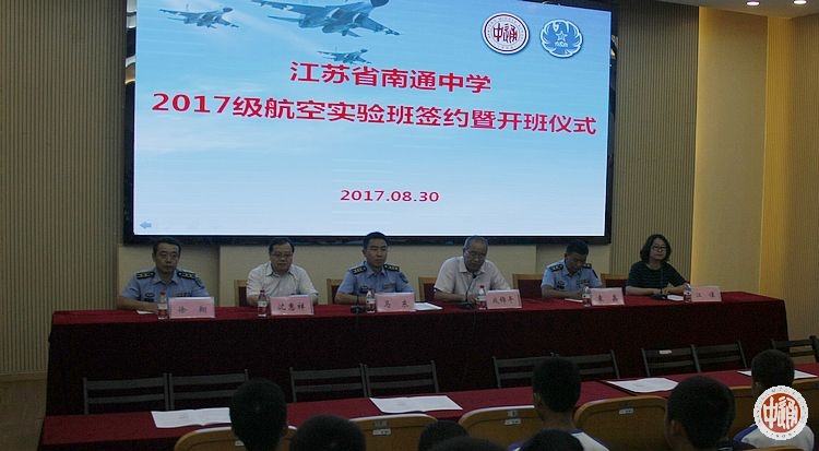 8月30日下午,2017级航空实验班签约暨开班典礼在学校科学楼三楼报告厅举行,2017级航空班全体学员及家长参会。空军招飞局南京选拔中心主任马东、保障科长袁鑫、心理选拔科助理徐翔,南通中学校长成锦平、副校长沈惠祥、国际国防教育处主任江谨等出席会议。