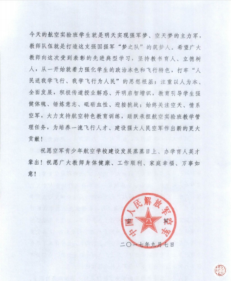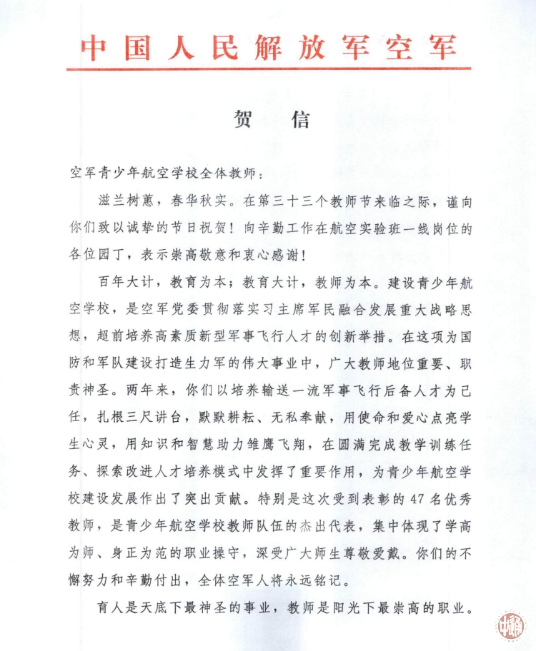 在第三十三个教师节来临之际,中国人民解放军空军向我校发来贺信,在致以诚挚的节日祝贺的同时,向辛勤工作在空军航空实验班一线岗位的广大教师表示崇高的敬意和衷心的感谢。