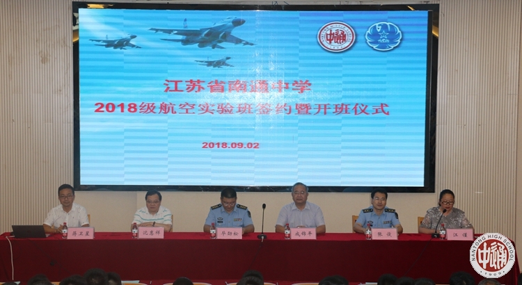 9月2日下午,南通中学空军青少年航空学校2018级航空班实验班签约暨开班仪式在学校科学楼三楼报告厅隆重举行。来自南通、泰州、盐城等我省10个地级市的50名航空班新学员及其家长参加签约暨开班仪式。出席活动的领导有空军招飞局南京选拔中心的书记毕劲松、组织计划科干事张俊以及我校校长成锦平、副校长沈惠祥等。仪式由学校国际(国防)教育处主任江谨主持。