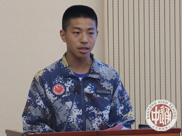 来自南通海安的学员贲煜代表全体2018级航空班学员发言。他激动的说:作为航空班的学员,是幸运的。经过千挑万选,一路披荆斩棘,最终才成为南通中学航空班第四期的学员;作为航空班的学员,是幸福的,因为我们有尊敬的领导指引我们成长;有来自老师和教官的陪伴和教导;作为航空班的学员,又是倍感温暖的,因为有爸爸妈妈的陪伴;作为航空班的学员,更是感觉到责任,要不忘初心、牢记使命,通过未来三年高中的勤奋学习、刻苦训练,未来一定要扶摇而上九万里、翱翔苍穹、卫我中华!