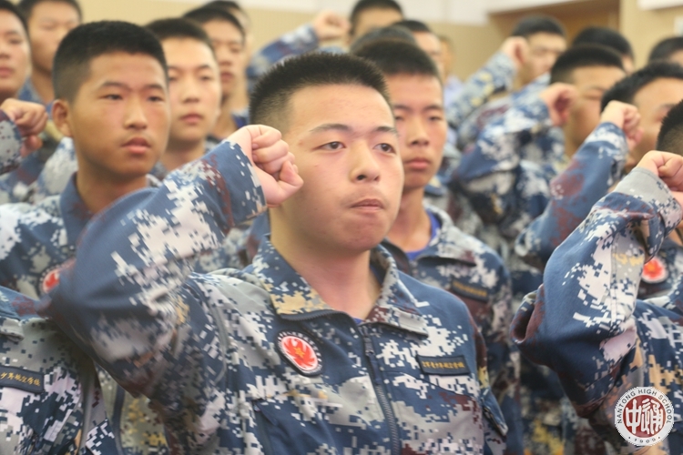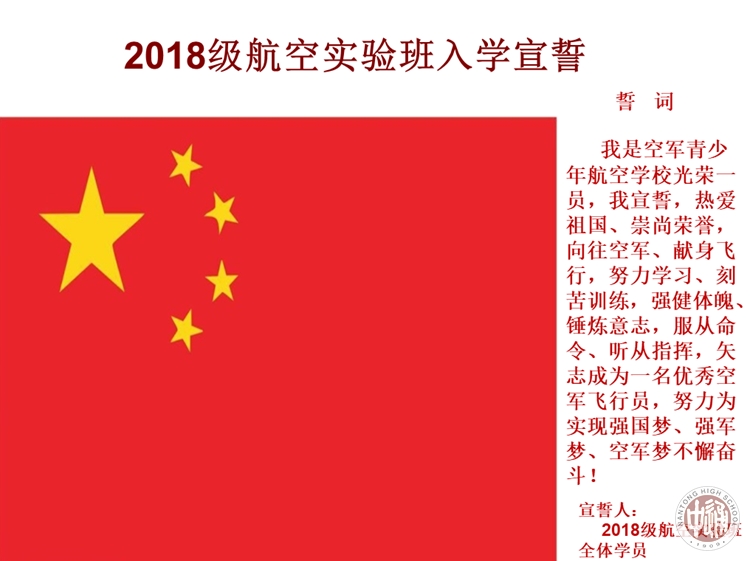 誓词:我是空军青少年航空学校光荣一员,我宣誓,热爱祖国、崇尚荣誉,向往空军、献身飞行,努力学习、刻苦训练,强健体魄、锤炼意志,服从命令、听从指挥,矢志成为一名优秀空军飞行员,努力为实现强国梦、强军梦、空军梦不懈奋斗!铿锵有力的宣誓,久久回荡在报告厅的上方!