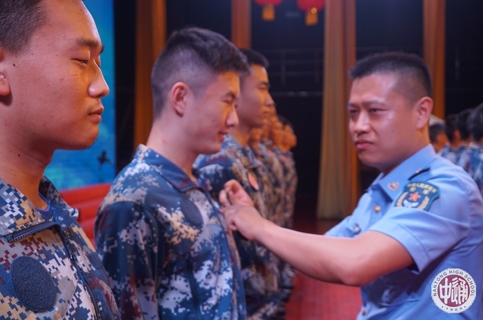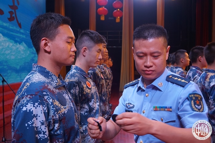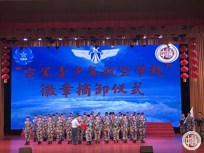 在空军驻校干部曹俊强队长和刘鑫教导员的精心组织下,活动的第三部分举行了“南通中学空军青少年航空学校2020届航空班徽章摘卸仪式”。在离别悲情的背景音乐中,两位驻校干部亲自为每一位高三航空班学员摘掉“空军青少年航空学校”的徽章。晶莹的泪光,闪烁在每一位同学的脸庞,摘卸的是标识航校学员身份的徽章,但摘不掉对航校生活的美好回忆、摘不掉浓浓的军营官兵情战友情。