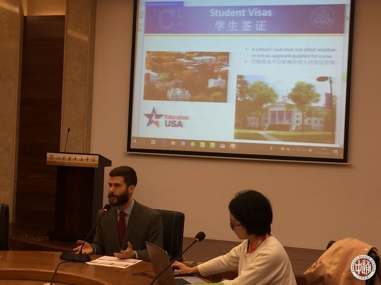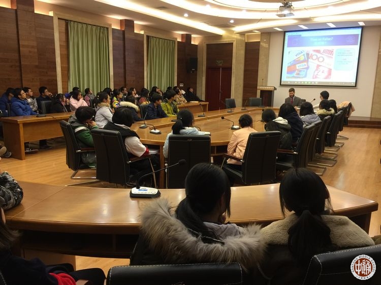 12月14日下午,美国驻沪总领馆副领事谭声民(James Tyson)在市外侨办张智强副主任的陪同下来访我校。沈惠祥副校长在国际教育交流中心热情接待了来宾。随后,谭声民先生在交流中心二楼会议室为国际班全体学生就“F1 学生签证”开设了主题讲座。