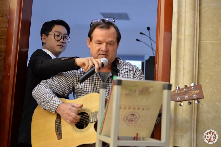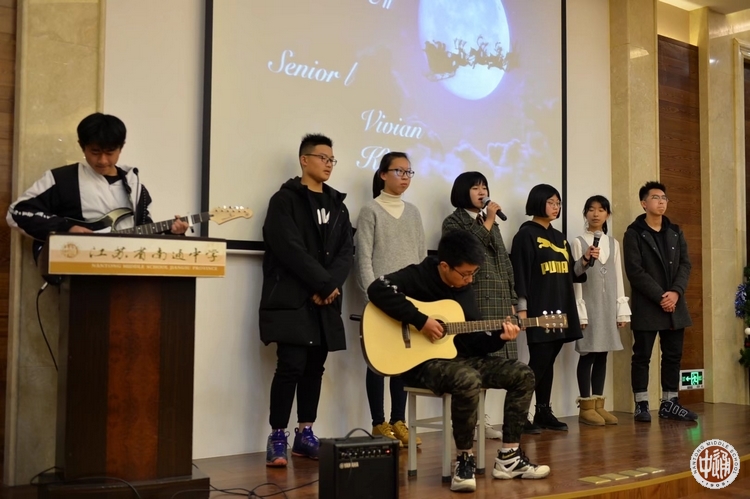 随后,高一20班同学吉他弹唱“My Love”。外教Patrick也带来了一首富有圣诞气息的歌曲。歌声宛转悠扬,华丽的音符在会议厅里缓缓回荡。