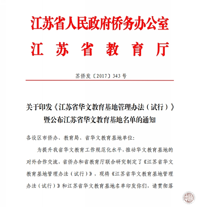 近日,江苏省人民政府侨务办公室、江苏省教育厅联合发文公布“江苏省华文教育基地单位名录”,我校名列其中。