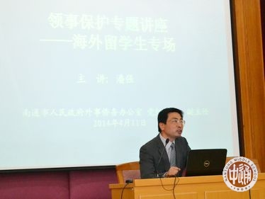 近年来,随着海外留学生人数及规模的不断增加,留学生被盗、被抢、交通安全等事件屡见不鲜,为降低在海外生活求学期间的风险,增强突发事件的应对能力,4月11日下午,国际部特邀南通市人民政府外事侨务办公室党组成员、副主任潘强在学校宏观楼二楼报告厅为国际部所有学生进行了题为《领事保护》的专题讲座。