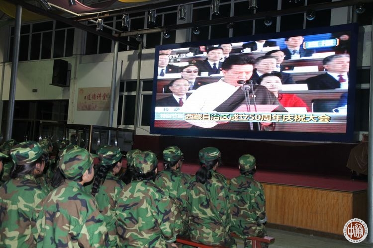 晚上,西藏班同学团聚在多功能大厅,一起观看“西藏自治区成立五十周年庆典”大会录像,让身在外乡的学子也能感受到来自家乡的喜庆。