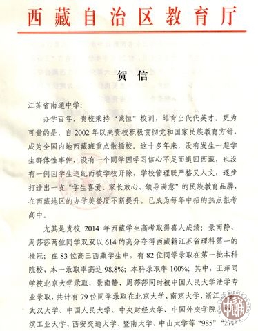 西藏自治区教育厅在贺信中指出,办学百年来,我校秉持“诚恒”校训,培育出代代英才;自2002年来,积极贯彻落实党和国家民族教育方针,积极打造具有通中特色的民族教育品牌,在西藏地区的办学美誉度不断提升,成为每年中招的热点高中。