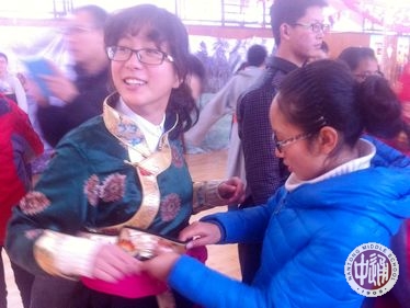 健雄馆里具体分为五个区,分别用来展示藏文化:一是藏装试穿区 西藏生们从自己宿舍里取来崭新的、颜色款式各异的藏装,吸引了众多汉族学生的极大兴趣,西藏生热情的为汉族学生试穿,并合影留念。二是藏族节日展示区 通过图文并茂的宣传板,生动形象的介绍了藏族特有传统节日,譬如藏历新年、转山会、雪顿节、望果节、沐浴节、谢水节等节日,让汉族师生深入了解藏民族的风俗习惯。三是藏式工艺品拍卖区 藏式手链、藏香、转经筒等精致的工艺品引得汉族老师和学生爱不释手,纷纷出手争购,西藏生们还把所售款项捐献给了学校爱心基金。四是藏式书法签名区 藏文字体变化多端,有象雄古文体、天珠体、吾钦体、簇仁体、簇通体、草书体等177种不同藏文字体,可谓博大精深。本次活动挑选了藏文社中书法特别优秀的同学为汉族师生用藏文书写汉名,受到了广大师生的热烈欢迎。五是锅庄表演区 锅庄舞是随着藏民族生产生活的发展变化而产生变化的,它既有表现藏族劳动的歌舞,也有颂扬英雄的歌舞。锅庄舞节奏之明朗、步伐之欢快,吸引了众多师生也情不自禁也加入了该舞蹈的行列。