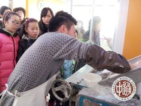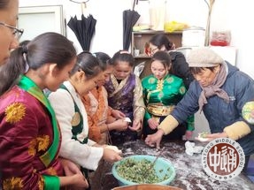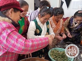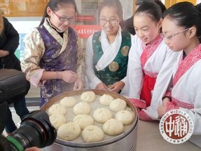 会场外更是热闹非凡,格桑曲珍、扎西拥宗、普珍等同学向社区居民学习做馒头。馒头是汉族传统面食,味道可口松软,营养丰富,是过年时餐桌上必不可少的主食之一。据传是三国时期诸葛亮发明的。馒头是把面粉加水、糖等调匀,发酵后蒸熟而成的食品,在制作时加入肉、菜、豆蓉等馅料。面点师傅详细的展示从活面团、发面、压面等各个过程,藏族学生看得非常认真。接着社区里的爷爷、奶奶手把手的教藏族学生做起菜肉馒头。不一会儿,热气腾腾的馒头出锅了,吃着自己制作的馒头,孩子们露出甜甜的笑容,一边吃一边说:“就像在家里过年一样。”
