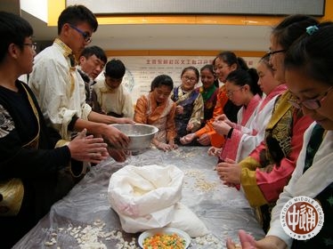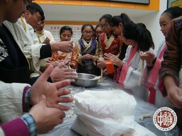 另一边也忙活的不亦乐乎,扎西旺杰、嘎德、索南益西等同学作为“导师”,指导汉族的少年制作藏式美食“古突”。吃“古突”是藏族的传统风俗。“古”即九,指的是腊月二十九,“突”即突巴,是一种面疙瘩粥。在藏历的腊月二十九吃“古突”以示辞旧迎新。制作“古突”需要多种食材,有面粉、牦牛肉、奶渣、人参果等,突巴团里会包有石子、辣椒、羊毛、木炭、硬币等九种不同的东西,分别代表“心肠硬”、“刀子嘴”、“心肠软”、“黑心肠”、“发大财”等九种不同的寓意。吃到这些东西的人要立刻吐出,引得围观的众人哈哈大笑,为迎新之夜增添了许多欢乐气氛。