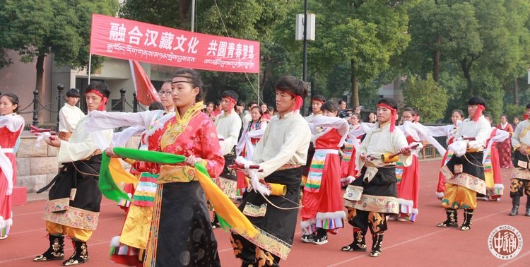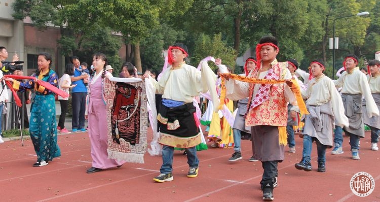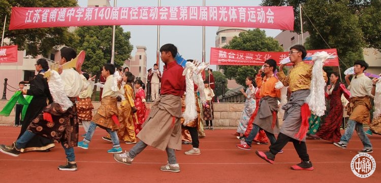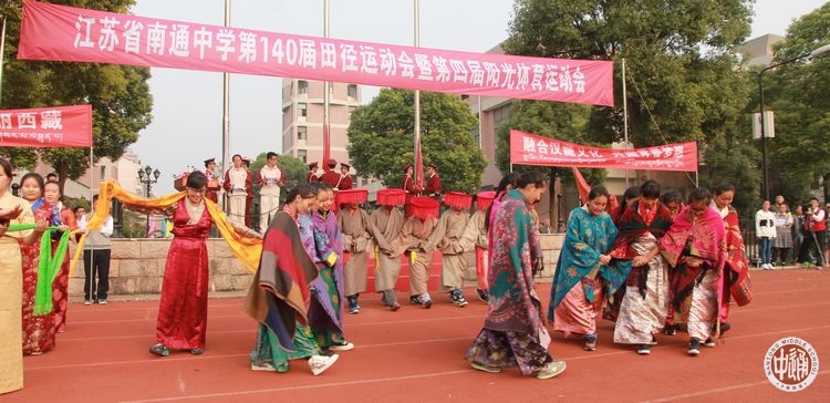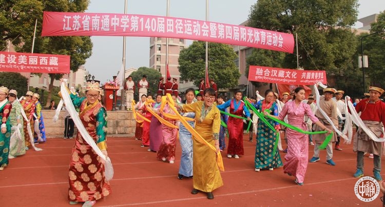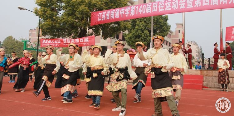 【编者按】10月22日下午,江苏省南通中学第140届秋季运动会暨第四届阳光体育运动会隆重开幕。在此次运动会开幕式班级方阵表演中,全校高一至高三六个西藏班276人组成最庞大的方阵,以“融合汉藏文化,共圆青春梦想”为主题,为学校汉族师生带来了一场极具西藏民族特色的文化表演。本次西藏班方阵由哈达鲜花表演队和拉萨表演队、日喀则表演队、山南表演队、林芝表演队、那曲表演队、阿里表演队、昌都表演队等7个代表西藏不同城市的方队组成,每个城市表演队向全校师生呈现了最具本地区特色的歌舞。清扬悠远的歌声,韵律十足的舞蹈深深吸引了在场的每一个人,欢呼声、鼓掌声不绝于耳。精彩的表演让每一个在场的汉族师生近距离的领略了西藏丰富而又瑰丽的文化艺术,感受到祖国文化的多彩和博大,进一步加深汉藏学生之间文化的交融。