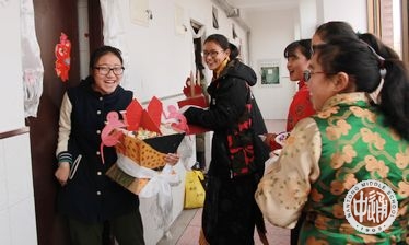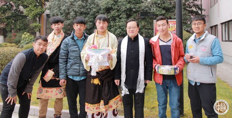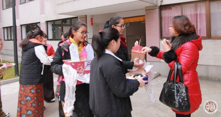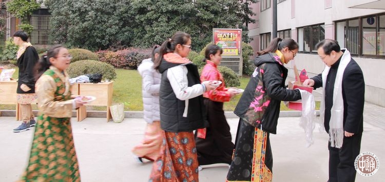 上午8时许,副校长沈惠祥、民族教育处主任於锡龄、西藏班的班主任老师和生活老师也赶来看望同学们,参与拜年活动。热情好客的西藏生排起长队,手捧自制切玛,唱着新年祝福的藏歌,一位位的给老师们敬献吉祥切玛和洁白哈达。老师们也用藏族的方式给同学们送上深深的新年祝福,祝福同学们在新的一年万事吉祥、扎西德勒!