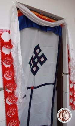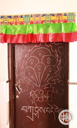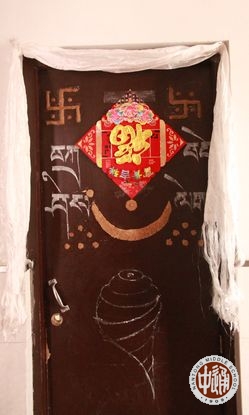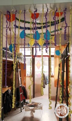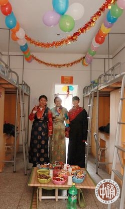 拜好年后,同学们还邀请老师们参观他们的宿舍。每个宿舍都经过了藏族学生们的精心布置:门上或用彩笔绘制了美丽的民俗图样,或挂上藏族风格的门帘;室内挂上吉祥的哈达和彩帘,扎上彩色的气球;室内正中摆上小桌,桌前铺上毛毡,桌上放置切玛和各色糖果、糌粑、牦牛肉、酥油茶的食品,整个宿舍既饱含独具特色的藏民族风情,又张显着浓浓的新年喜庆。参观的老师和同学饶有兴趣的欣赏着、点评着,选出他们心中的“最美藏俗宿舍”。(图16-26)