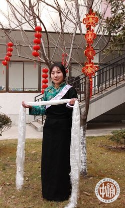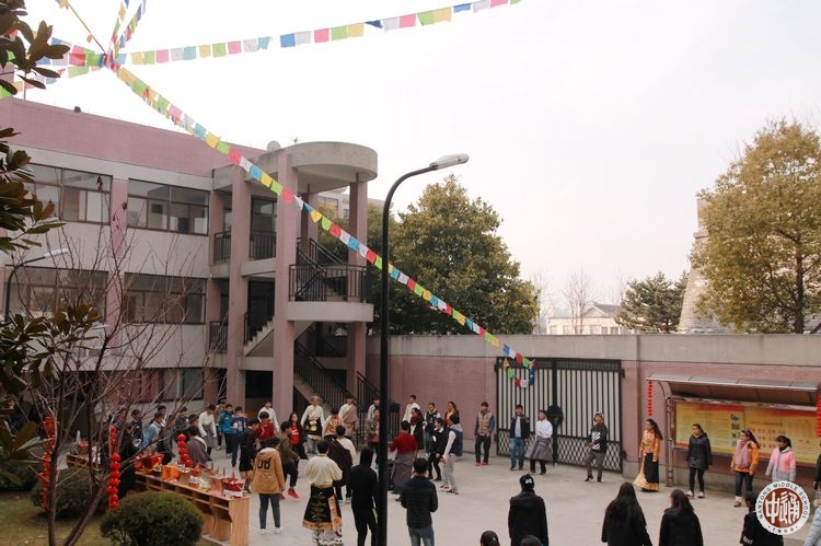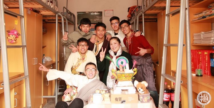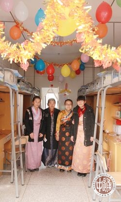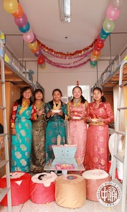 五彩的经幡高高挂起,艳丽的藏装美美穿起,各色手制切玛满满的摆起,欢快的藏歌畅快的唱起,奔放的锅庄舞热烈的跳起!农历正月初二,也正是藏历火猴年的第一天,学校公寓大院内充满了浓浓的藏历新年的味道!一大早,西藏生以宿舍为单位三四人结伴,手捧自制的美丽切玛,端着浓浓的酥油茶,提着满盘的藏式糕点糖果和牦牛肉,到一个个宿舍串门拜年。被造访的同学会热情的打开房门,挑开门帘,迎接拜年的伙伴们的到来。他们用手捏取切玛里的一点糌粑向天空抛洒,互道祝福,并用宿舍里准备好的藏式小点心和饮料款待造访者。一声声“扎西德勒”,一阵阵叫好欢笑响彻在宿舍楼内。