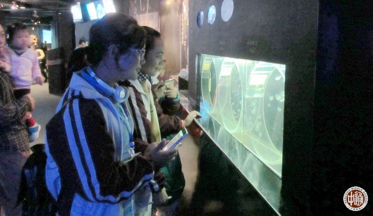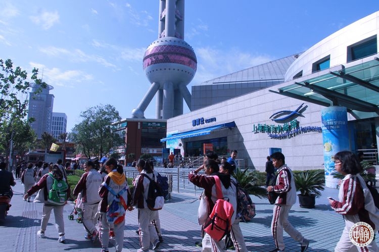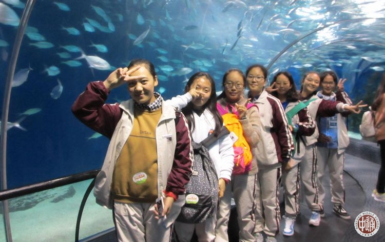 上午,学生们参观了位于浦东的上海海洋水族馆。他们驻足于每一个展柜前,仔细阅读着旁边的说明文字,充满好奇的观赏着水中的海洋生物,在水族馆里世界上最长的海底隧道中尽情欣赏,兴奋之情溢于言表。