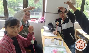 立夏时节,有谚称:“立夏胸挂蛋,孩子不疰夏。”疰夏是夏日常见的腹涨厌食,乏力消瘦。立夏我们有挂蛋、斗蛋的传统习俗。5日,高二18班葛老师利用班会课时间给同学们讲述立夏时节汉族的斗蛋、尝新、“秤人”等传统,内容妙趣横生,同学们听得兴味盎然。葛老师特意买来五彩丝线和煮熟的鸭蛋,亲自教学生编织五彩网袋。数条彩线在心灵手巧的藏族孩子们的手中很快就编成了一个个漂亮的网袋,放入鸭蛋,乐滋滋的挂于颈上。接下来的斗蛋游戏,同学们三五成群,没经验者竟以蛋尾击蛋头,破者认输,粲然而笑。