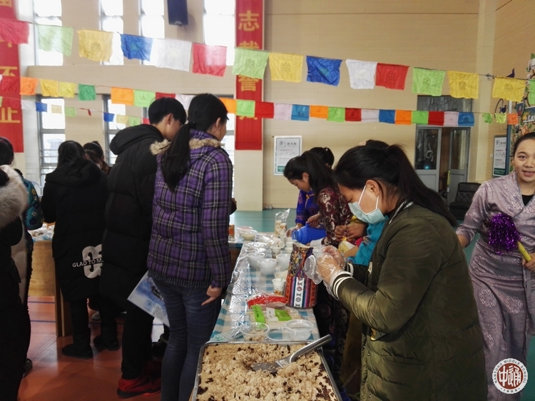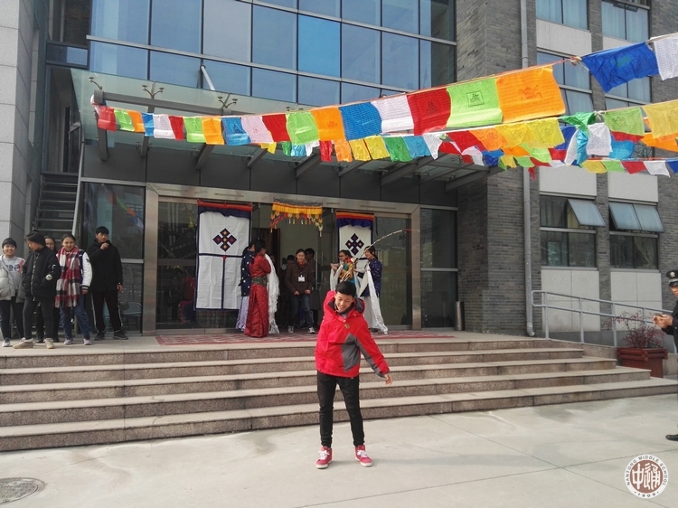 用藏式门帘装饰的正门口,几位身着藏族服饰的同学手捧切玛和哈达,以藏族传统的新年迎宾方式热情的欢迎老师和同学们的到来。正门前的小广场上,高二的西藏同学给大家表演他的绝活“甩牧羊绳”,一条约两米长的编织棉绳在他手里挥舞得“啪啪”作响。几位汉族老师和同学也跃跃一试,却都挥不出那清脆响亮之声,看来这是个看似简单,实则不易的功夫活。