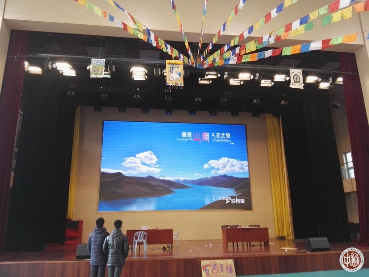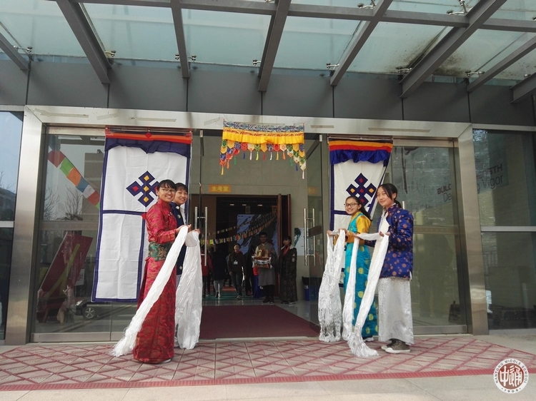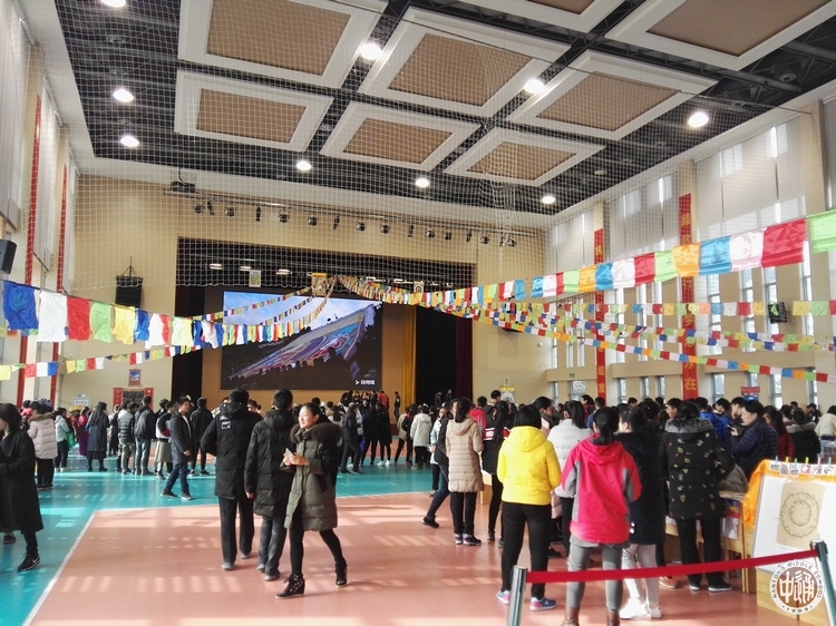 一年一度的学校汉藏文化交流的盛宴“藏文化宣传周”又如期而来。今年的藏文化集中展示活动首次安排在学校新体育馆,敞亮的活动空间、现代化的影音设备为本次藏文化集中展示助力,也为西藏班同学对活动的创意设计增添了平台。12月27日中午,冬日暖阳中新健雄馆内人群攒动,渲染着浓郁的藏文化气息。健行馆内和正门外的小广场上飘扬着五彩经幡,内场的舞台上方悬挂着藏式唐卡,上面绘制着一头大象立于树旁,象背上顶着一只猿猴,猴背上顶着一兔,兔背上又有一鸟,这个图案即是藏文化中的“和睦四瑞”图,寓意尊老爱幼、和睦共处。舞台的右侧墙面张贴着大幅的藏语经文,内容为辟邪求福,藏文字体优美,具有很高的欣赏价值。左侧则是一大张牦牛挂画,独具藏式风情。舞台正中央的大屏幕上循环播放着由高二西藏班同学剪辑的西藏风光宣传片,优美壮丽的画面,悦耳澎湃的旋律,令每一个参与活动的汉族师生心生向往。